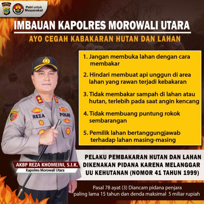 Morowali Utara, Xtimenews.com – Kapolres Morowali Utara (Morut) AKBP Reza Khomeini, himbau warga masyarakat untuk tidak membuka lahan dengan cara membakar karena bisa menjadi salah satu penyebab terjadinya kebakaran hutan, menimbulkan kerugian yang cukup besar.