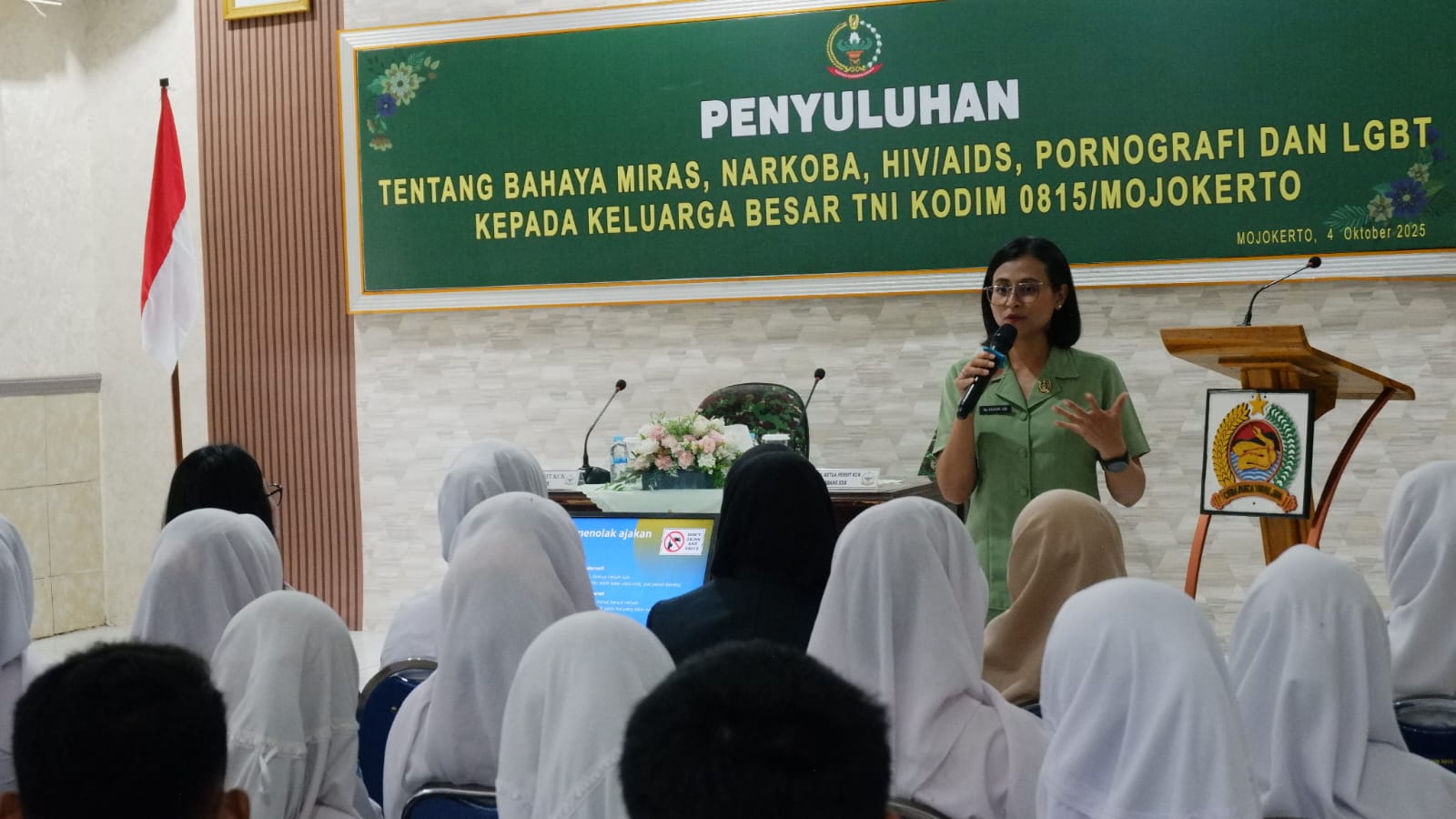 Mojokerto,Xtimenews.com – Persit Kartika Chandra Kirana (KCK) Cabang XXX Kodim 0815/Mojokerto menggelar penyuluhan bertema Hidup Sehat bagi keluarga besar TNI dan generasi muda, bertempat di Aula Makodim 0815, Jalan Majapahit Nomor 01 Kota Mojokerto, Jawa Timur, Sabtu (04/10/2025). Kegiatan ini dihadiri anggota Persit, siswa SMP, SMA, hingga mahasiswi. Penyuluhan disampaikan langsung oleh Ketua Persit KCK Cabang XXX Kodim 0815, Ny. Anjani Abi Swanjoyo, yang juga berlatar belakang akademisi psikologi.