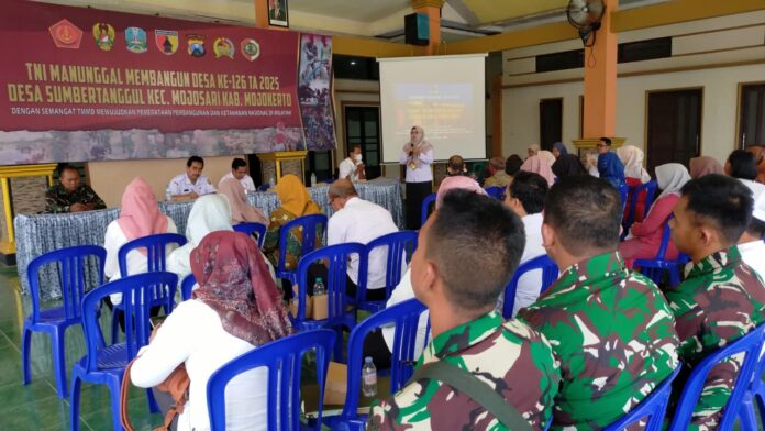 Mojokerto,Xtimenews.com – Satuan Tugas (Satgas) TNI Manunggal Membangun Desa (TMMD) ke-126 Kodim 0815/Mojokerto kembali melanjutkan sasaran nonfisik dengan menggelar penyuluhan Pemberdayaan Masyarakat dan Desa penting bagi masyarakat. Kali ini, sosialisasi difokuskan pada Pelayanan Publik dan Administrasi Kependudukan di Desa Sumber Tanggul, Kecamatan Mojosari, Kabupaten Mojokerto, Jawa Timur, Rabu (15/10/2025) .