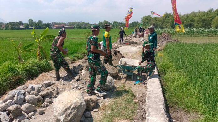 Dengan penuh semangat, para prajurit TNI dan masyarakat bahu-membahu mengangkat batu, mencampur semen, hingga merapikan susunan material di sepanjang jalan usaha tani. Keringat yang menetes tak menyurutkan tekad mereka untuk menuntaskan pekerjaan sesuai target. Kerjasama erat antara Satgas TMMD dan warga menjadi wujud nyata kemanunggalan TNI dengan rakyat di lapangan.