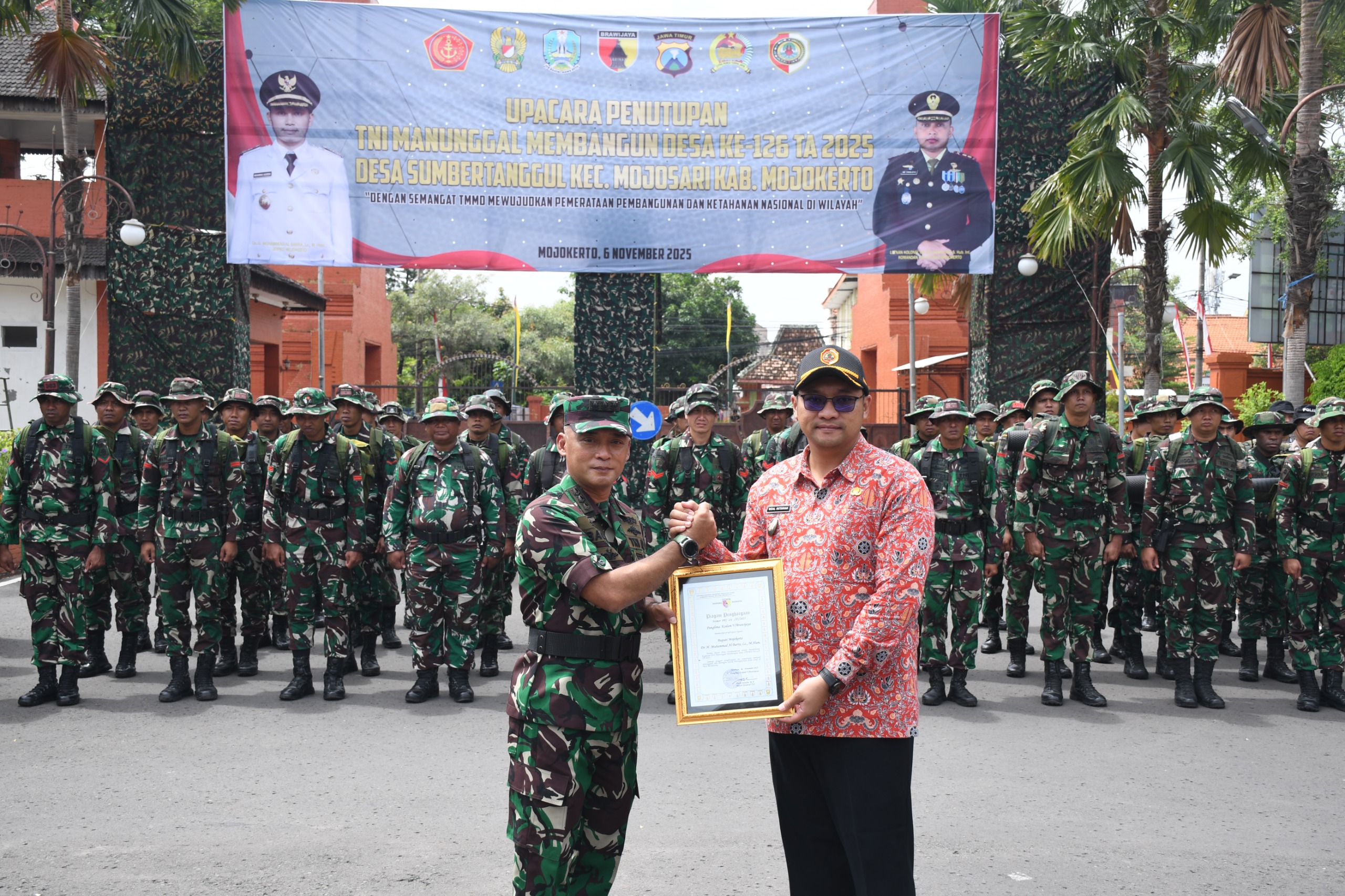 Penutupan TMMD ke-126 juga ditandai dengan penandatanganan naskah berita acara serah terima hasil pekerjaan dan penyerahan prasasti TMMD kepada Pemerintah Kabupaten Mojokerto, dilanjutkan pemberian piagam penghargaan dari Pangdam V/Brawijaya.