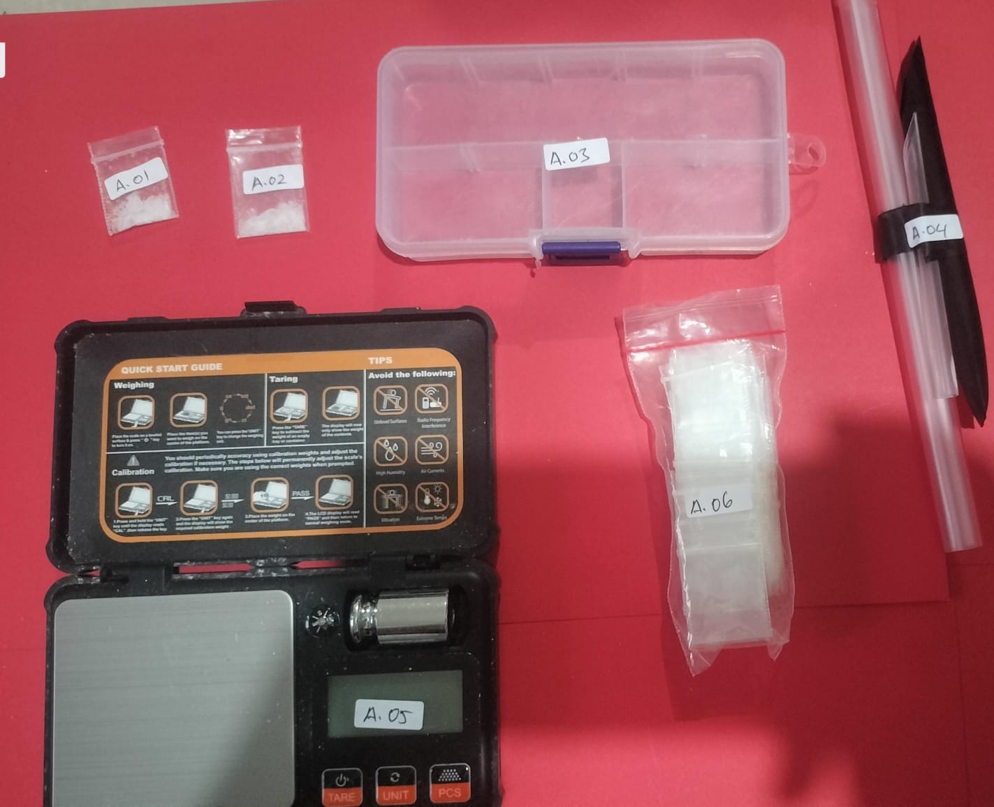 Ketika dilakukan penggeledahan badan dan rumah tempat tinggalnya, petugas menemukan 2 paket sabu, kantong plastik klip kosong, 3 sendok pipet, 1 unit timbangan digital, serta kotak plastik bening yang diduga digunakan dalam melakukan aktivitasnya.