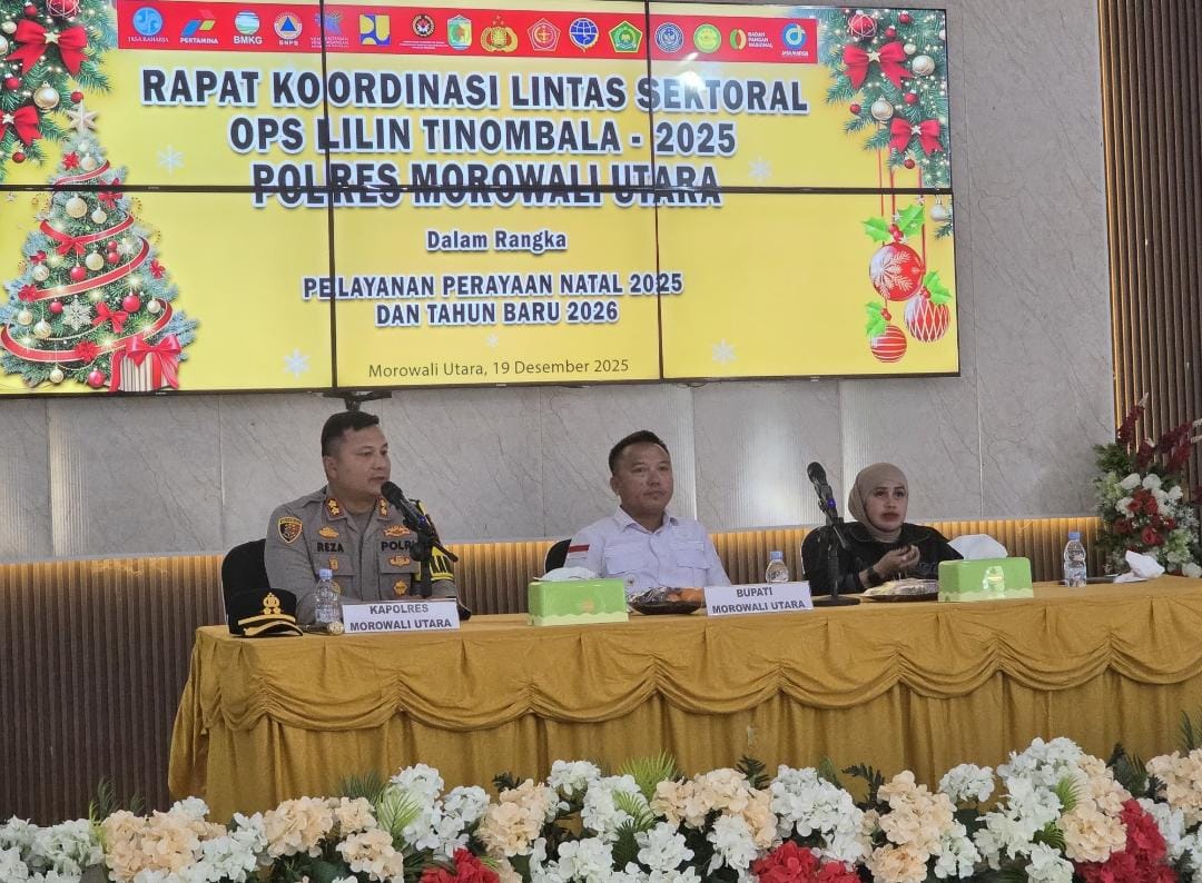 Morut,Xtimenews.com – Untuk mengamankan perayaan Natal 2025 dan Tahun Baru 2026 (Nataru), Polres Morowali Utara (Morut) menggelar Rapat Koordinasi (Rakor) Lintas Sektoral Bidang Operasional Ops Lilin “Tinombala” 2025, di aula Polres Morut, Jumat (19/12/25), dipimpin Kapolres Morut AKBP Reza Khomeini. Dihadiri Bupati Morut Delis Julkarson Hehi, Wakil Ketua DPRD Morut Hj. Mega Ambo Asa, PJU Polres Morut, pejabat OPD serta instansi dan lembaga terkait.
