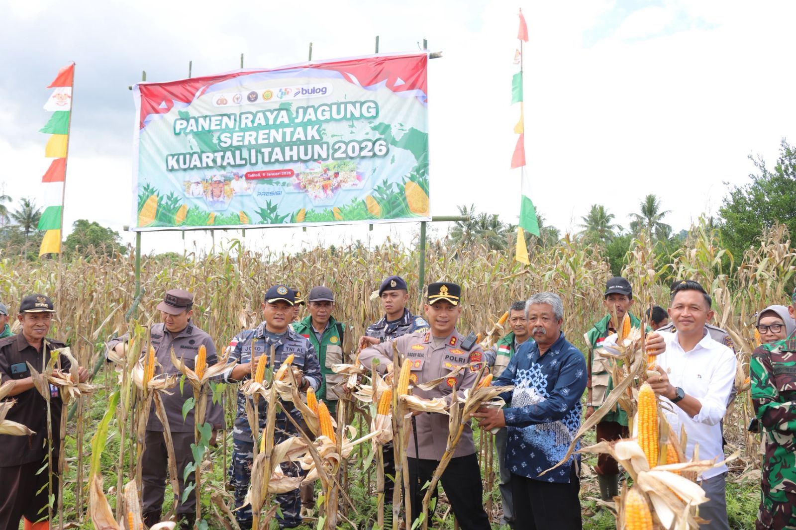 Tolitoli,Xtimenews.com – Panen Raya Jagung Serentak Kuartal I Tahun 2026, digelar di Dusun Batuan Desa Ogomatanang Kecamatan Lampasio Kabupaten Tolitoli, pada Kamis (8/1/26), dihadiri Kapolres Tolitoli AKBP Real Mahendra, Kepala Kejaksaan Negeri Tolitoli Ibnu Firman Ideamin, Dan Lanal Tolitoli Letkol Laut (P) Joko Ariyanto, Asisten Bidang Ekonomi dan Pembangunan Tolitoli Rustam Rewa, Wakil Ketua II DPRD Tolitoli I Nyoman Muliade, Dan Ramil 1305-01 Baolan Kapten Inf. Eko Wahyudi, Camat Lampasio M.Yasin, Kapolsek Lampasio Iptu Muh. Fathun Latowale, Kades Ogomatanang Usman bersama perangkat, Koordinator Balai Penyuluhan Pertanian Lampasio Sunardi, PPL se Kecamatan Lampasio, PJU Polres Tolitoli bersama personil Polsek Lampasio serta Kelompok Tani “Bunga Mekar” Desa Ogomatanang.